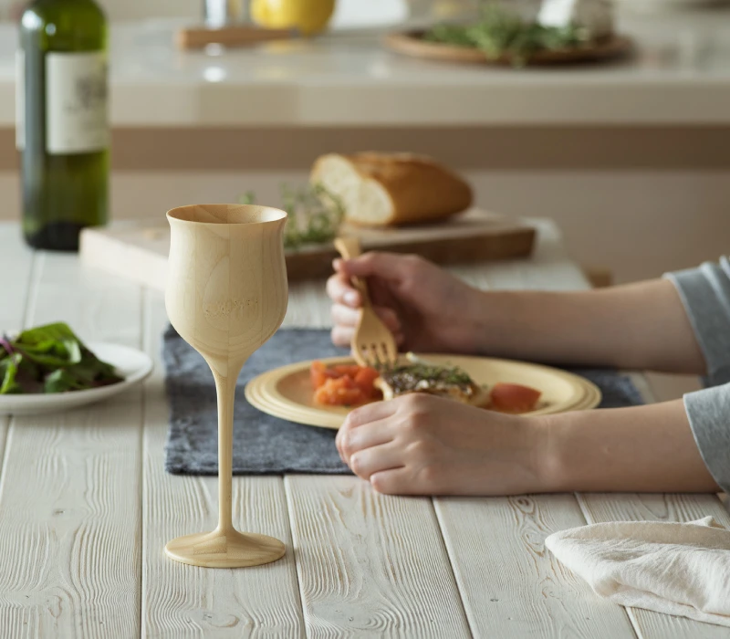 洗練されたシルエットのワイングラスで、天然素材ならではの味わいの変化を伝えたい。