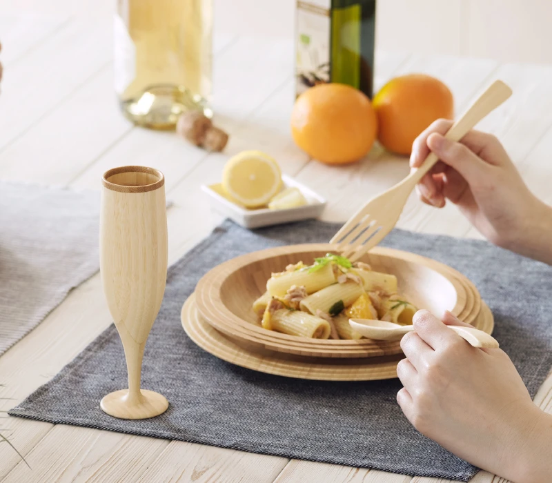 硬さを感じやすい陶器やガラス製食器とくらべ、見た目も質感もやわらかな天然素材食器。「しっくりとなじむ手ざわり」と「やさしくなめらかな口あたり」は天然素材ならでは。
