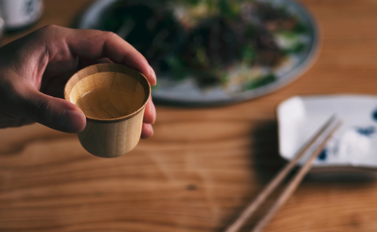 陶器や金属、ガラス製に比べ熱伝導率の低い天然素材製のRIVERET。お酒の味わいを邪魔しないその理由は、そそがれる液体や外気の温度に左右されず、うつわ自体の温度が安定していることにあります。手作りが生み出すやさしいくちあたりだからこそ、伝えることのできる味わい。
