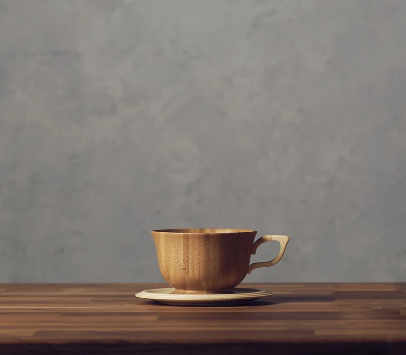 上品なシルエットのティーカップ&ソーサー。コーヒーや紅茶の味わいを邪魔することの無い、なめらかな質感。竹が持つ軽さと強度をいかした、程よい薄さの飲み口。