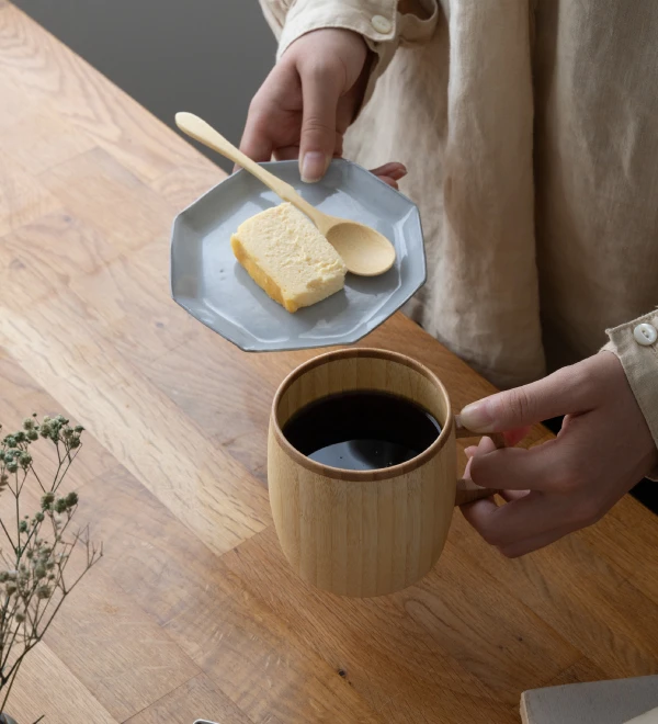 硬さを感じやすい陶器やガラス製食器とくらべ、見た目も質感もやわらかな天然素材食器。「しっくりとなじむ手ざわり」と「やさしくなめらかな口あたり」は天然素材ならでは。