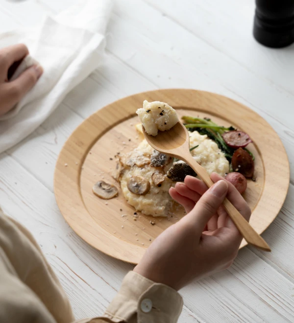 硬さを感じやすいステンレス製食器などとくらべ、見た目も質感もやわらかな天然素材食器。「しっくりとなじむ手ざわり」と「やさしくなめらかな口あたり」は天然素材ならでは。