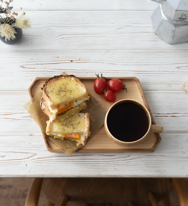 軽めの朝食やティータイムにおすすめ、コンパクトなサイズのサイドトレイ。斜めにカットされた特徴的なデザインは、おしゃれでスタイリッシュな印象だけでなく、もちやすさも考慮。もちろん複数枚のスタッキングも可能。